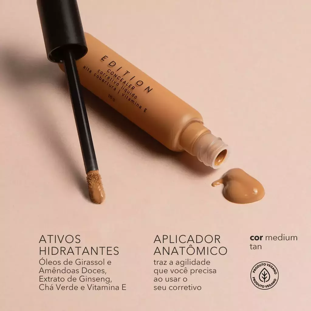 O Concealer contém Óleo de Girassol, Óleo de Amêndoa Doce, Extrato de Ginseng, Vitamina E e Chá Verde. Isso sem falar que sua formulação vegana é ideal para quem ama make e não abre mão de produtos que prezam pelo bem-estar animal.
